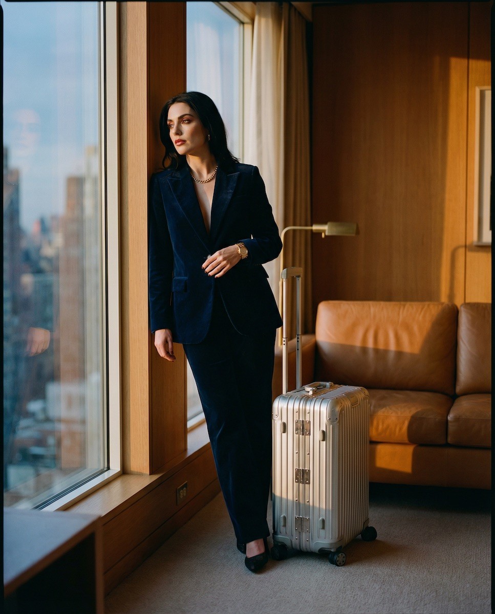 Das Model verkörpert eine selbstbewusste, urbane Reisende. Ihr dunkelblauer Veloursanzug, klare Linien und ruhige Körperhaltung vermitteln Professionalität und kultivierte Gelassenheit. Die Interaktion zwischen Model und Koffer schafft eine authentische Reisegeschichte, die sich organisch in die Umgebung einfügt.