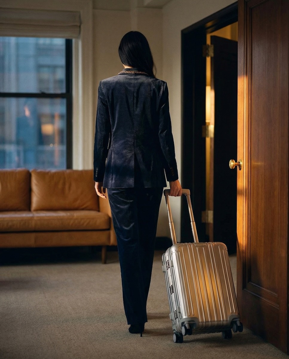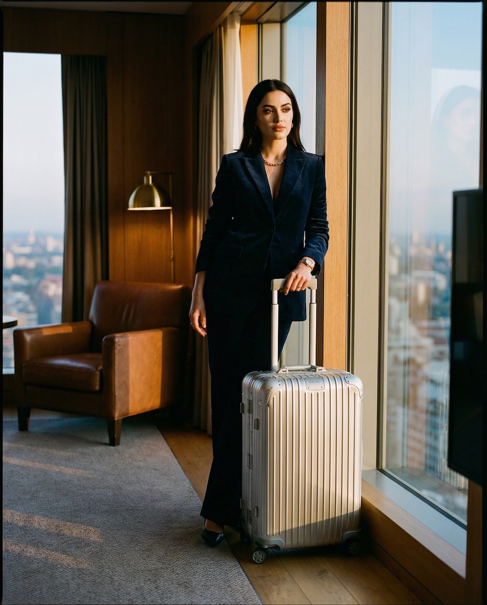 Die Bildreihe erzählt das Gefühl eines frühen Morgenmoments vor einer Geschäftsreise: der Blick aus der Hotelsuite, die Stille eines hochwertigen Raums, der Koffer als verlässlicher Begleiter. Das Ergebnis ist ein visuelles Narrativ aus Nostalgie, Reisekultur und moderner Eleganz.